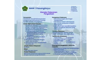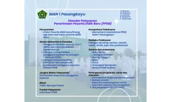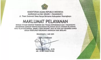 Maklumat Layanan MAN 1 Pasangkayu adalah komitmen untuk memberikan pelayanan publik sesuai standar pelayanan yang ditetapkan oleh lembaga. MAN 1 Pasangkayu bertekad untuk terus memberikan pelayanan prima sesuai dengan ketentuan yang berlaku ...