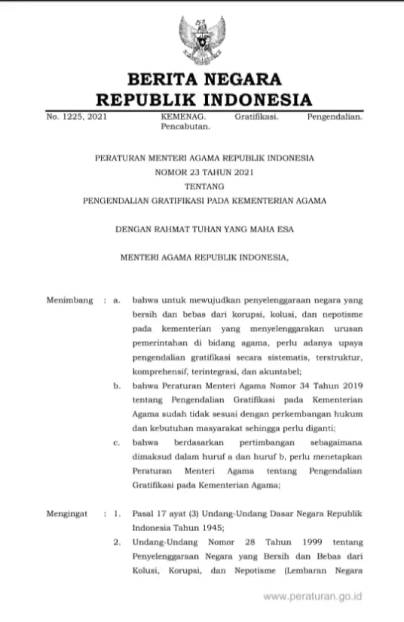 Link Download dokumen Permenag Nomor 23 Tahun 2021 tentang pengendalian Gratifikasi di Kementerian Agama RI